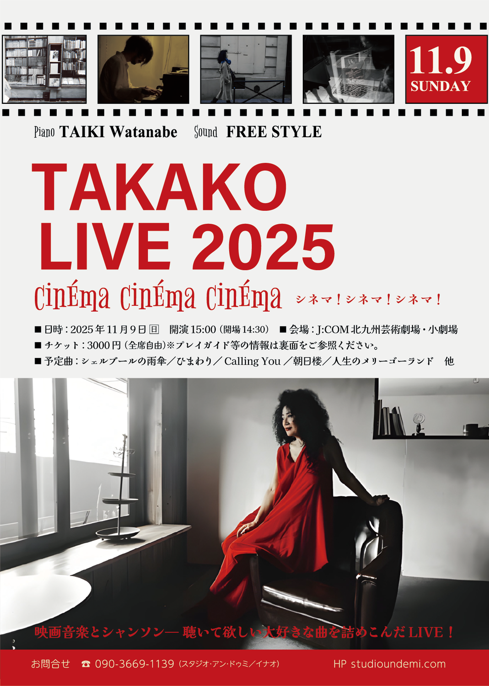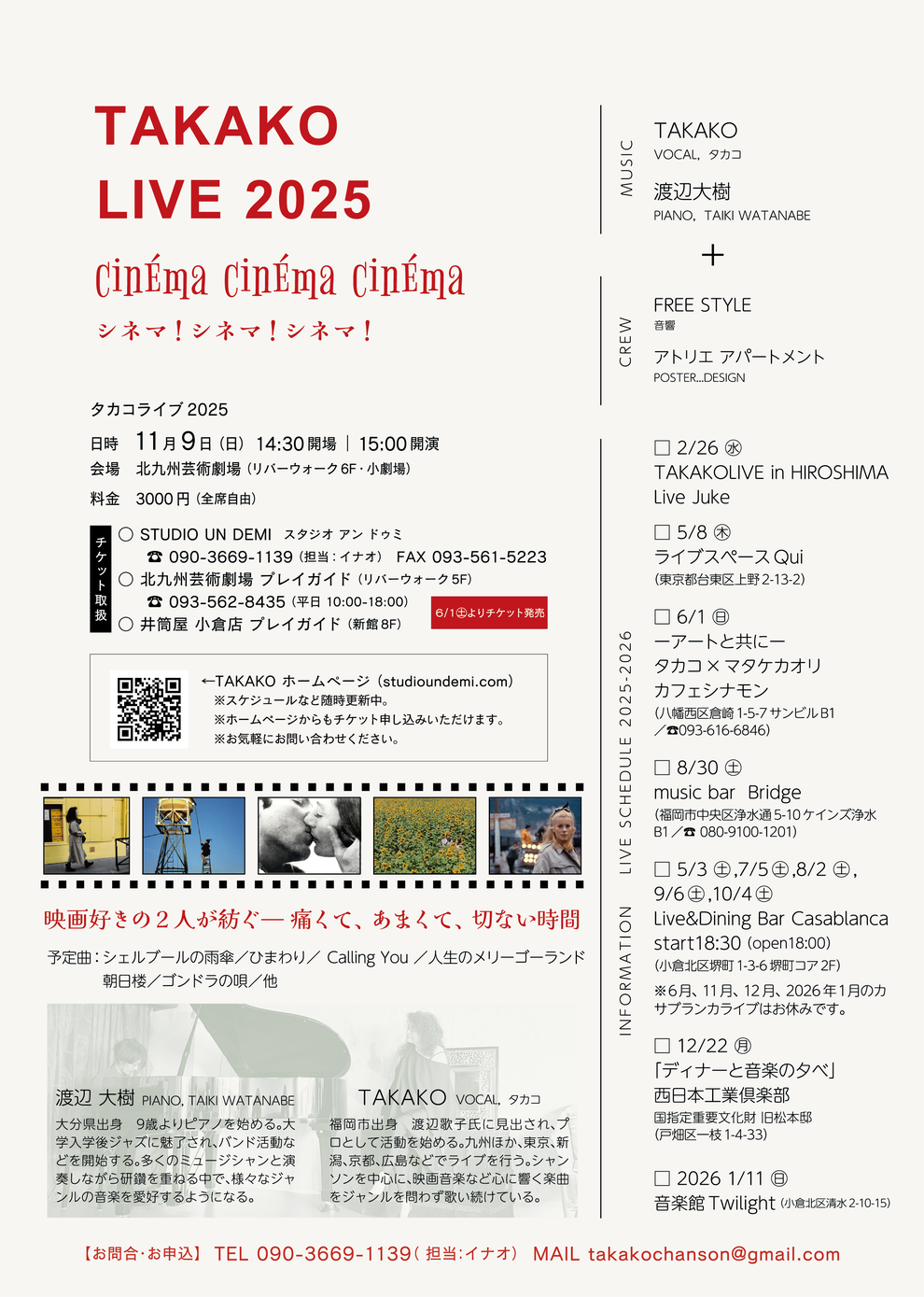 TAKAKO LIVE 2025 PIANO 渡辺大樹 チケットお取り扱い □北九州芸術劇場プレイガイド(リバーウォーク5F) □小倉井筒屋プレイガイド(新館8F) □スタジオアンドゥミ (メールアドレスかお電話番号を忘れずにご記入ください) ・お電話での予約 TEL 090-3669-1139(担当:イナオ) ・メール